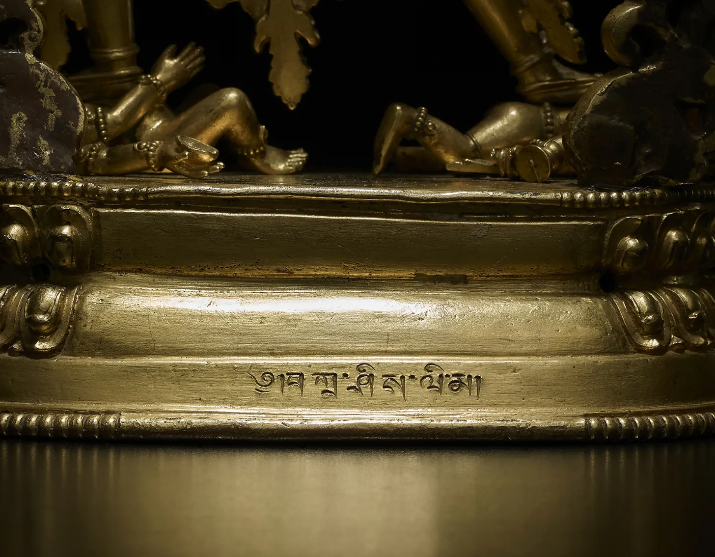 Dagyab notes that similar appellations exist for other sculpture groups, such as ‘dod li which indicates manufacture at the workshop known as ‘dod ‘jo dpal ‘khyil, the renowned workshop and foundry near the base of the Potala in Lhasa. Dagyab describes the Tashi Lima as “well known and similar to the Lhasa ‘dod li.” David Weldon and Ian Alsop, both Himalayan sculpture experts, note that this inscription also appears on sculptures that are c. 17th century interpretations of earlier sculptural styles.