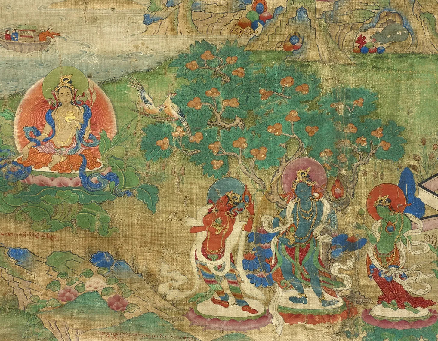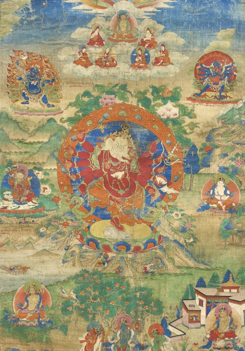 To the sisters’ right is another wealth deity, the goddess Vasudhara holding a golden vase, and a grain stalk at her shoulder. Moving clockwise, are seen the wealth deity Vaishravana, Bhutadamara Vajrapani, and powerful Sakya hierarchs including Kunga Sangpo (1382-1456), Sakya Pandita (1182-1251), and Phakpa Rinpoche (1235-80). Also present are Chakrasamvara and Aparajita. In the middle ground, just to the right of Ganapati is a lake from which emerge mountain peaks and upon which three figures are making a journey in a small boat. Green mountains and blue or green trees dominate the landscape. Above, deities and revered hierarchs take their place in an azurite sky. The fine line, rich palate, and pleasing composition make this a particularly appealing work of the late 18th or early 19th century.